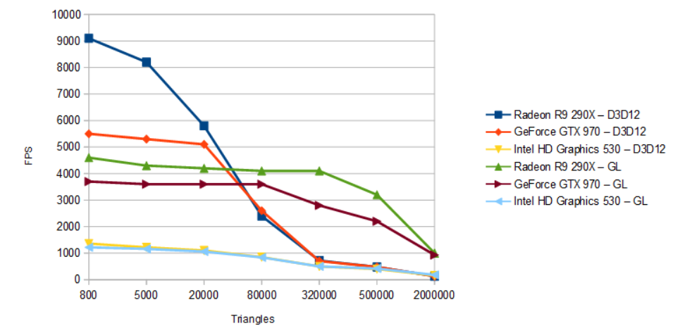 "Bu testlere göre, üçgen sayısı düşük olduğunda Direct3D 12, OpenGL'den daha hızlıdır. Özellikle AMD Radeon ekran kartları bu durumda oldukça hızlı! Ancak yaklaşık 80.000 poligon civarında, Direct3D ve OpenGL benzer bir performans sergiler. 80.000 poligonun üzerinde ise OpenGL daha hızlıdır. Intel GPU'lar ilginç bir durum sergiliyor çünkü D3D12 ve OpenGL'de hemen hemen aynı performansı sunuyorlar. Dahası, 2 milyon poligonluk bir ağda, Intel GPU, D3D12'de GTX 970 veya R9 290X'ten daha hızlı! Görünüşe göre, birçok poligon işlendiğinde, D3D12'nin renderleme işlem hattında bir yerde CPU kaynaklı bir dar boğaz oluşuyor ve bu durum GPU'ların gerçek gücünü tam olarak yansıtmıyor. Sonuçlar, en son sürücülerle (R361.43 / Crimson 15.12) benzer şekilde. Ayrıca basit bir çizim stres testi yaptım: Bir dörtgen (quad) sırasıyla 100, 400 ve 4000 kez işleniyor. Donanım instancing kullanılmıyor ve her dörtgen kendi çizim çağrısıyla işleniyor. Testleri yalnızca geliştirme sistemimde, GeForce GTX 960 + R361.43 ile yaptım."