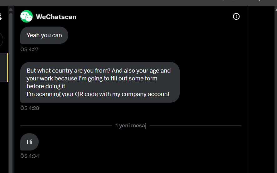 WeChat sisteminde QR kod taraması için böyle bilgilere ihtiyaç **YOKTUR**. Gerçek bir kullanıcı kodu tarar ve işlem tamamlanır. Sana sorular soran, kişisel bilgi isteyen, form bahanesiyle detay isteyen biri **yüksek ihtimalle dolandırıcıdır**.